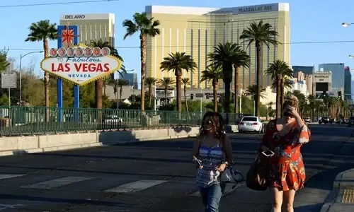 Two women leave the area where the attack took place, with the Mandalay Bay hotel in the background