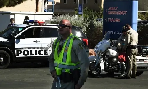 Police keep watch outside the trauma department at the University Medical Center in Las Vegas