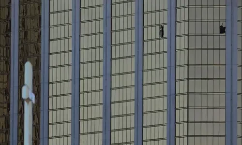 Two broken windows at the Mandalay Bay hotel, from where the shooter attacked festivalgoers