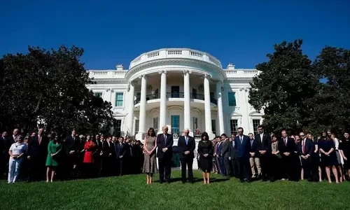 Donald and Melania Trump, along with Mike and Karen Pence, take part in a moment of silence in front of the White House