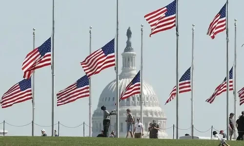 A National Park Service worker lowers US flags to half mast on the grounds of the Washington Monument