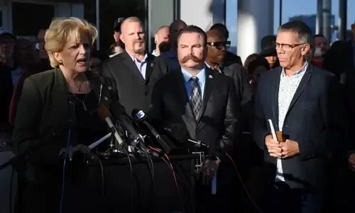 Carolyn Goodman, the mayor of Las Vegas, speaks to the media as Pastor Troy Martinez and Pastor Paul Goulet look on during a prayer vigil outside Las Vegas City Hall