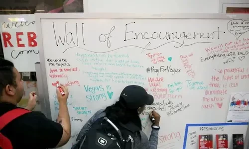 People pay tribute to those who died at a memorial on the Las Vegas strip