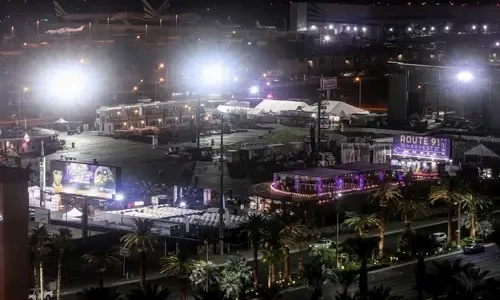 A view from a nearby building of the scene at Route 91 country music festival at 10.08pm local time.