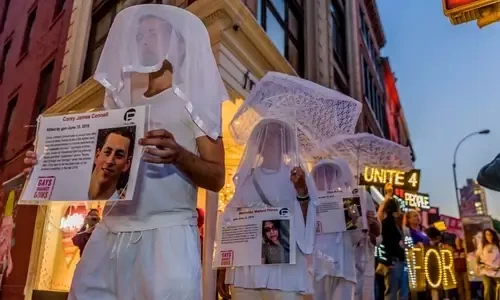 People wearing veils take part in an anti-gun march from Union Square Park to Times Square in New York City