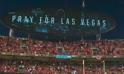 A message on a video board during a moment of silence before Kansas City Chiefs’ NFL game against Washington Redskins in Kansas City, Missouri